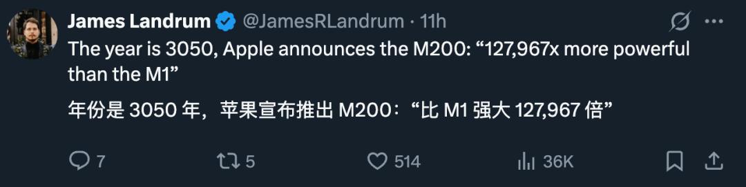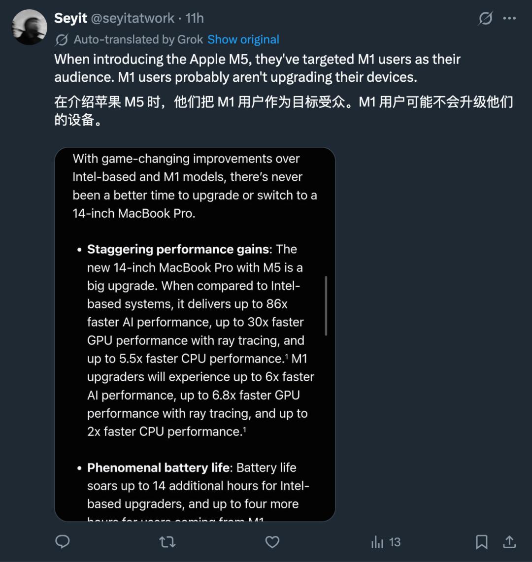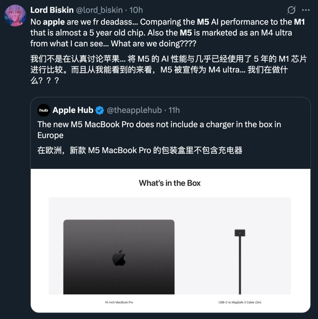 而这些人可能恰恰就是 M5 的目标群体,因为苹果的通稿中一直把 M5 的性能与 M1 对比,这让网友感到无语。