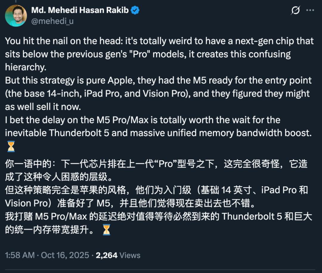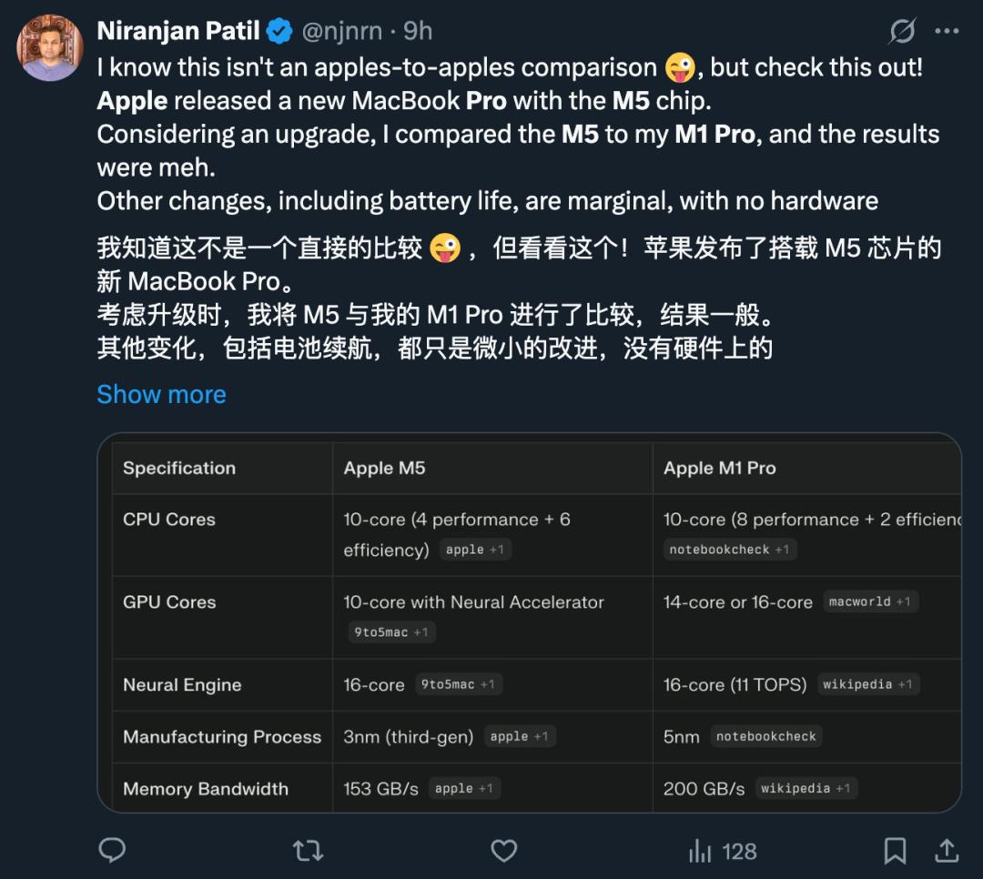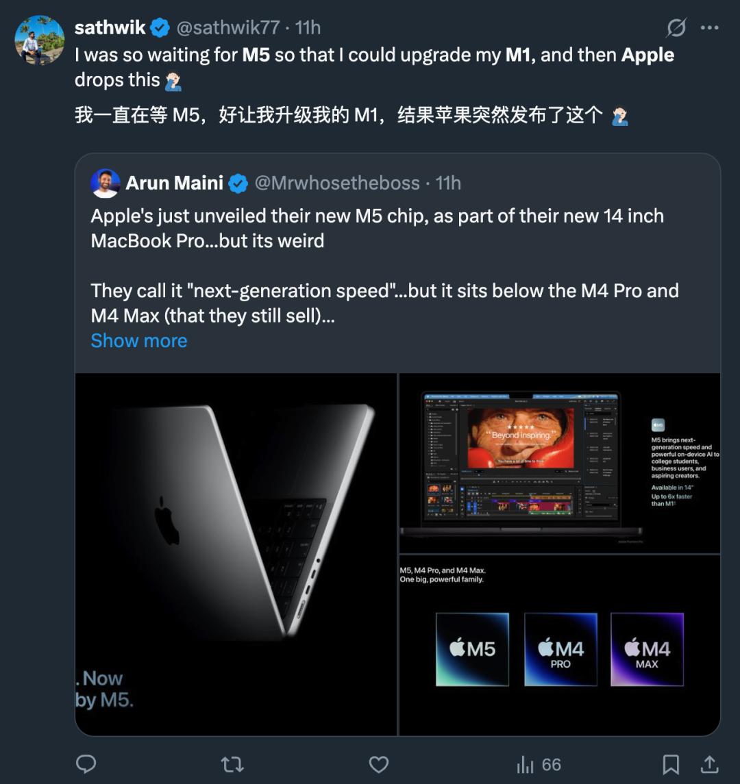 有意思的是,一些还在用 M1、M1 Pro 的果粉看到 M5 也犹豫了。