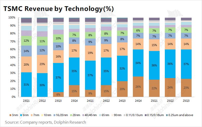 本季度7nm以下的收入占比维持在74%,先进制程领域是公司的核心收入来源。具体来看,本季度公司3nm收入占比为23%,5nm的收入占比维持在37%。当前公司的3nm和5nm产能都已经满产,公司2nm工艺也将在年末开始量产。