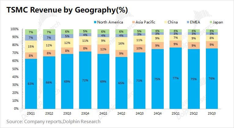 从各地区收入来看,北美地区仍是台积电最大的收入来源,收入占比为76%。这是由于北美地区有苹果、英伟达、AMD、高通等大客户,使得台积电和美国之间有很强的商业绑定关系。
