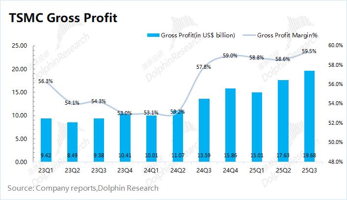 台积电在2025年第三季度实现毛利19.7亿美元,环比增长11.6%。其中毛利率59.5%,环比提升0.9pct,公司本季度主要是在规模效应影响下,摊薄了部分单位成本。