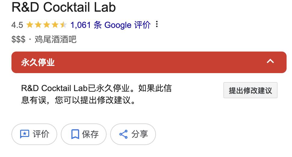 据悉,这家酒吧屡获国际大奖,并曾入选亚洲50佳酒吧,不过目前谷歌地图显示该酒吧已经永久停业。