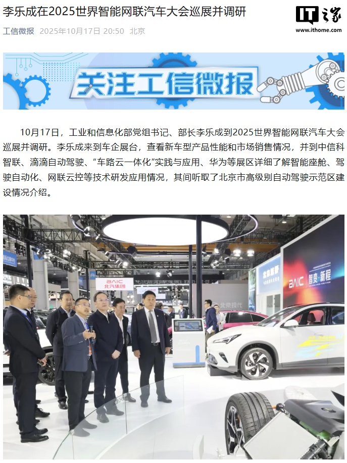 IT之家 10 月 17 日消息,今日,工业和信息化部党组书记、部长李乐成到 2025 世界智能网联汽车大会巡展并调研。