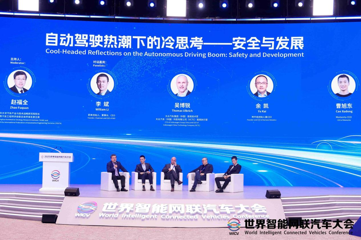 10月16日,第八届世界智能网联汽车大会正式拉开帷幕。在全体会议环节,大会围绕《自动驾驶热潮下的冷思考——安全与发展》这一主题,举办了一场圆桌对话。地平线余凯博士与蔚来李斌、大众汽车吴博锐、Momenta曹旭东展开深度对谈,聚焦自动驾驶落地过程中的责任担当、商业模式以及发展愿景,展开了一场兼具理性分析与远见卓识的思辨交流。地平线余凯博士结合自身企业发展历程,深入分析了自动驾驶产业面临的现实挑战与未来走向。