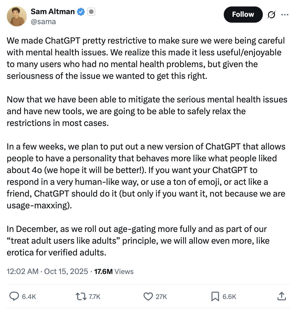 他的大意是:以前为了保护心理健康,ChatGPT 被我们限制得太严了……接下来,我们会放宽这些限制,让它更像人,更有个性。