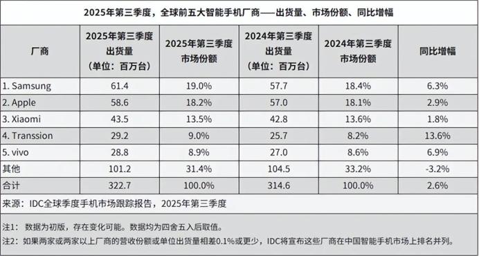 同样是来自IDC数据,2025年第三季度,三星、苹果、小米、传音和vivo稳居全球出货量前五,其他厂商共享约31.4%的市场份额。结合2024年数据,荣耀手机全球市场份额应该在4%-5%左右,与TOP5有较大差距。考虑到全球市场的复杂性和竞争强度,短时间内突围有难度。