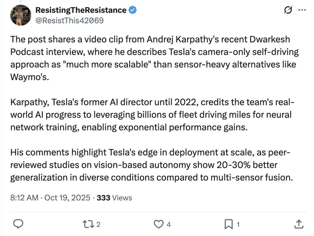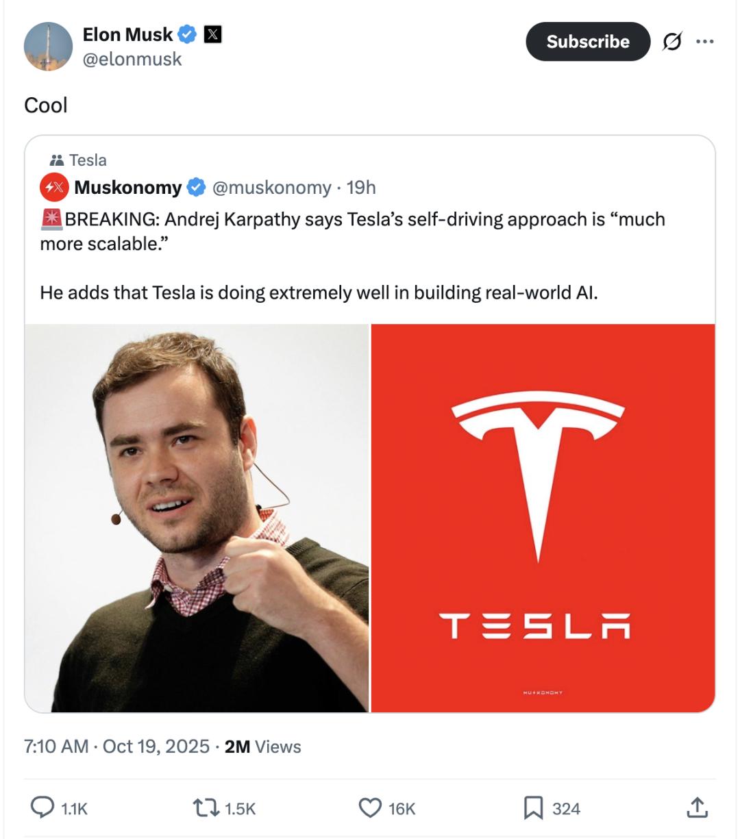 紧接着,不到一小时,马斯克又转发了卡帕西称赞特斯拉自动驾驶的帖子。