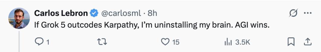 也有网友表示,如果Grok 5赢了卡帕西,那么AGI就来了。