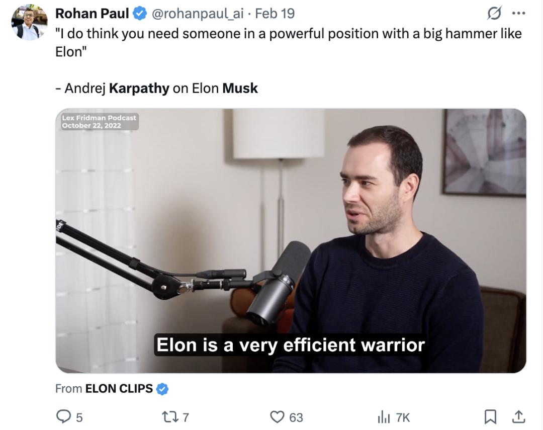例如,就在几个小时之前,马斯克还说Grok 5将来会比卡帕西强。