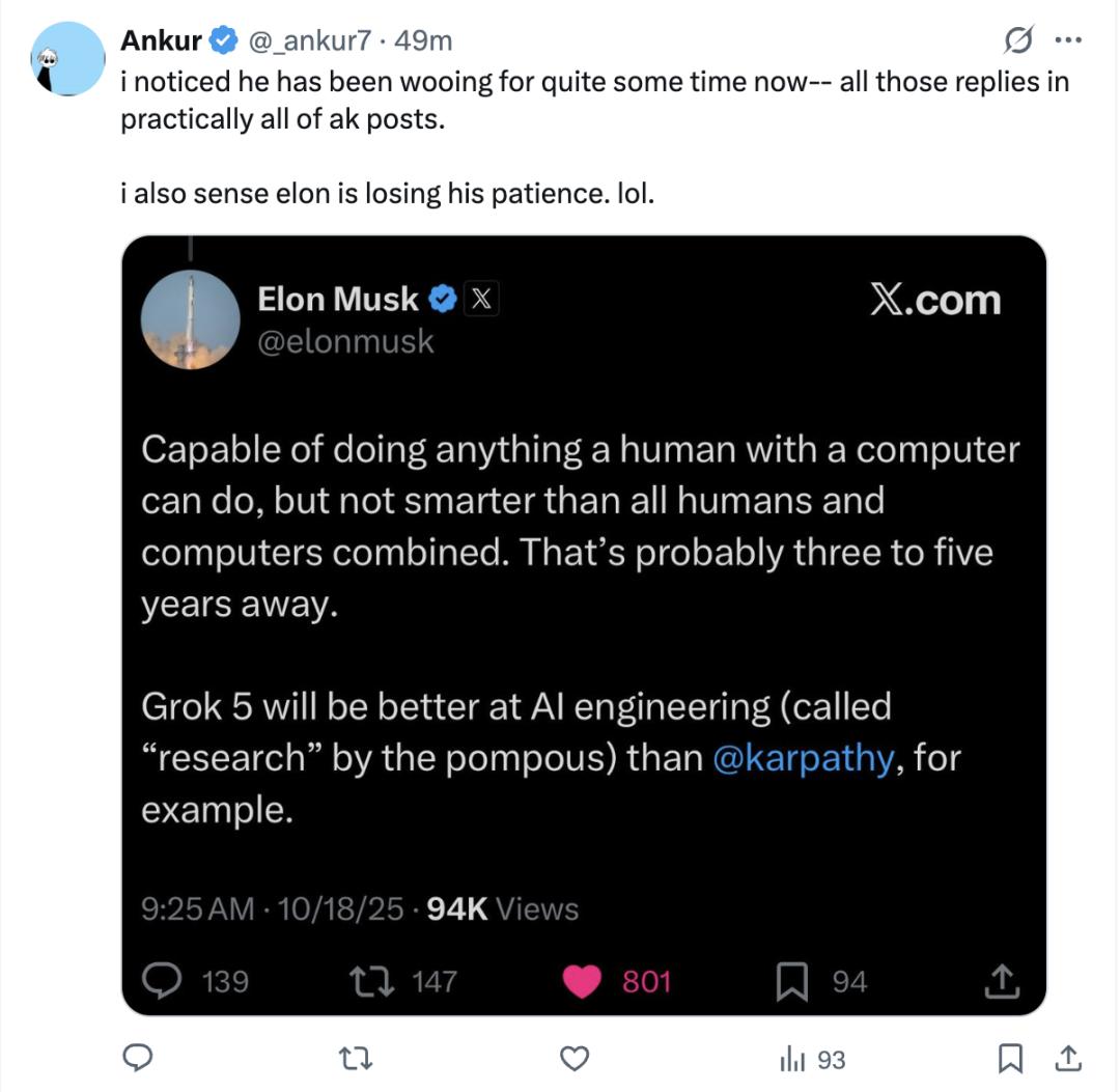 比如,Grok 5会跑到GitHub上拷贝卡帕西的代码然后打败他吗?