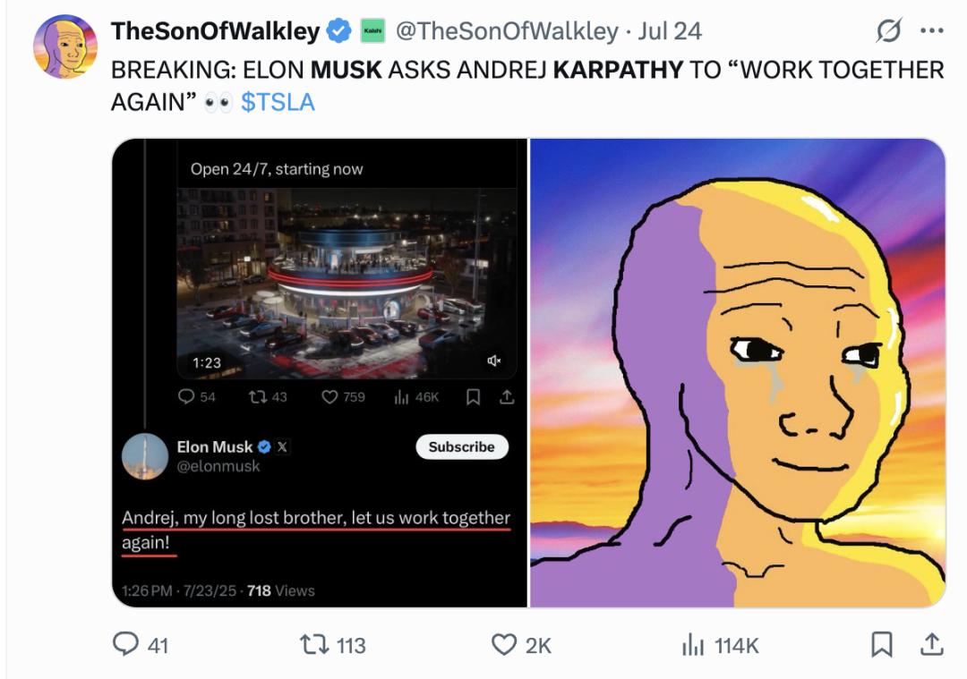 卡帕西离职后仍表达过“未来愿回归特斯拉”的意愿,马斯克也多次表示欢迎。