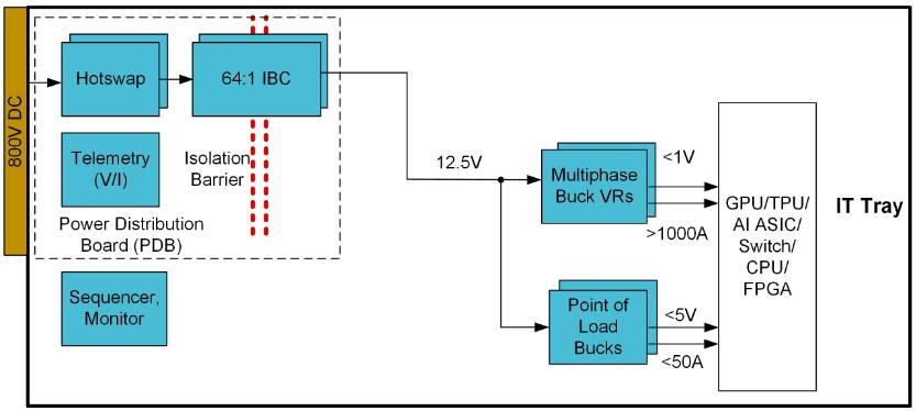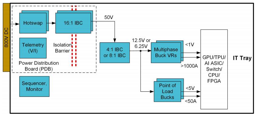 目前,800VDC存在着两种转换架构,一种为三段转换架构(800V→50V→12.5V/6.25V→<1V):800V 经 16:1 IBC 转换为 50V(效率 98%),再经 4:1 IBC 转换为 12.5V(效率 98%),最后通过多相降压稳压器转换为核心电压(效率 92%),整体峰值效率约 88%。