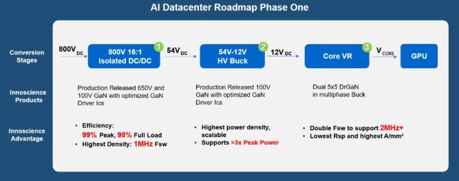 除了向800V机架电源过渡外,该架构还要求在800V到1V的电压转换中实现超高功率密度和超高效率。只有氮化镓功率器件(GaN)能够同时满足这些严苛要求。