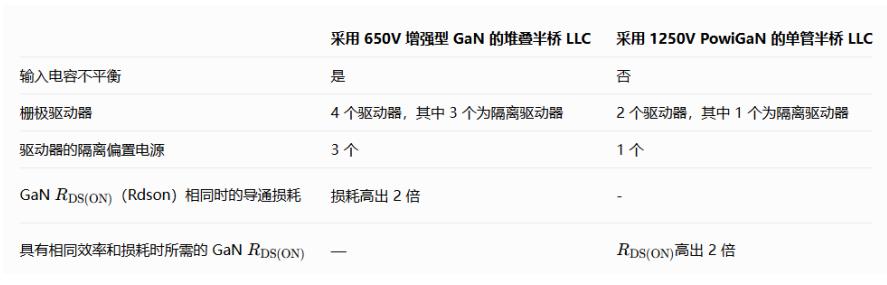 为在800VDC母线应用中充分发挥GaN的优势,通常会采用两个650V GaN器件进行串联堆叠的半桥结构,共计使用四个650V GaN器件。虽然这种堆叠拓扑结构可以在GaN所能达到的高频下工作,但它带来了若干挑战,包括控制复杂性增加、输入电压不平衡导致的可靠性风险、占用空间增大以及导通损耗增加,从而导致效率降低和成本上升。相比之下,在此应用中采用1250V额定耐压的PowiGaN开关,不仅能显著简化功率变换器拓扑结构,更能充分利用GaN的特性——正是这些使其成为理想的高频功率开关。