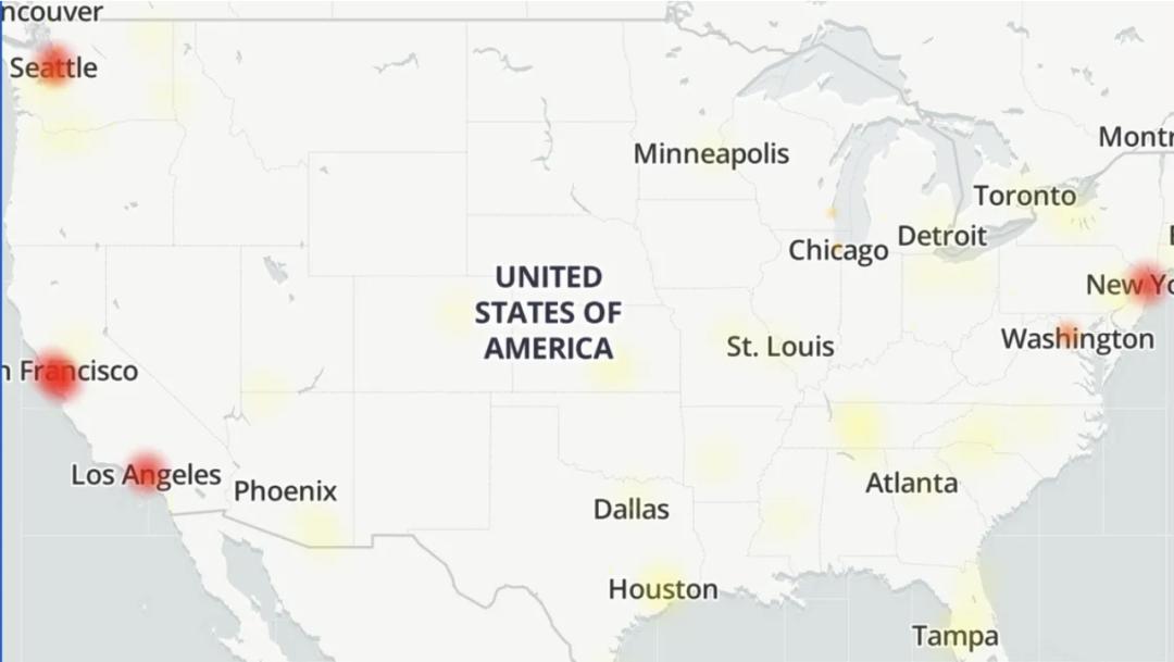 美国几大城市都在报告问题|图源:Down Dectector