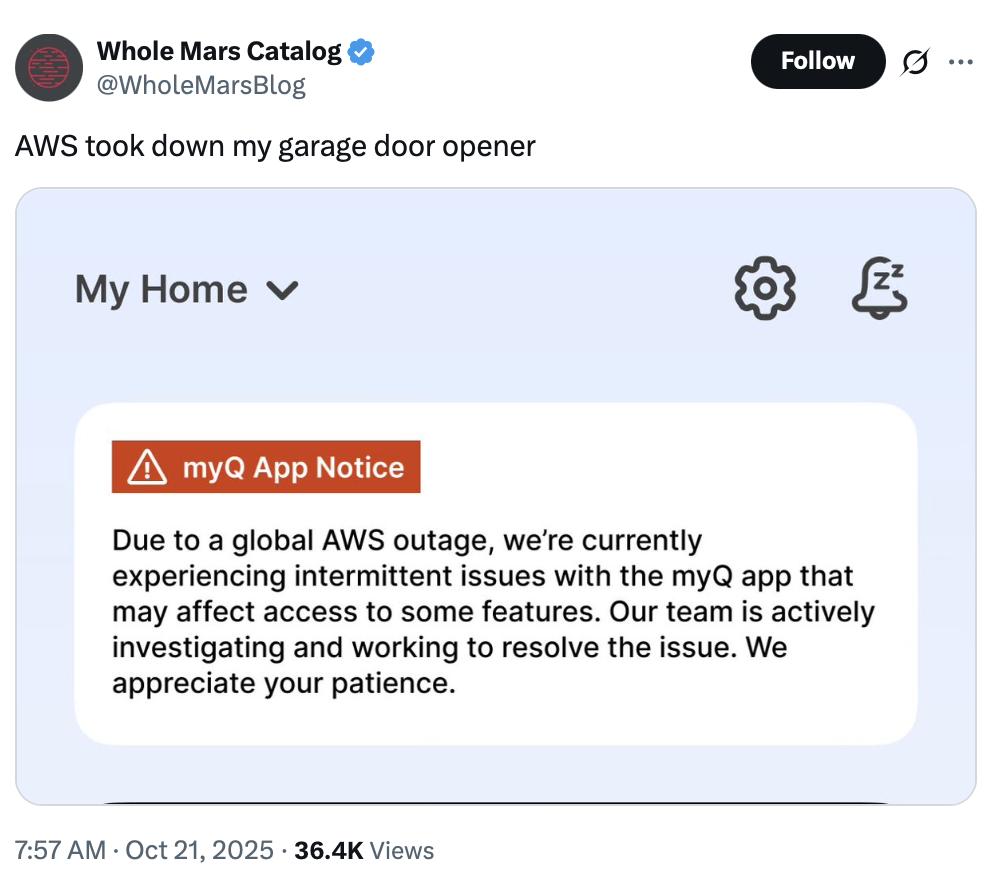 Ring 智能门铃服务也挂了,用户看不了监控,甚至打不开房门。还有用智能车库的特斯拉车主,打不开车库门。就连美联航的机场调度系统都受到了影响。