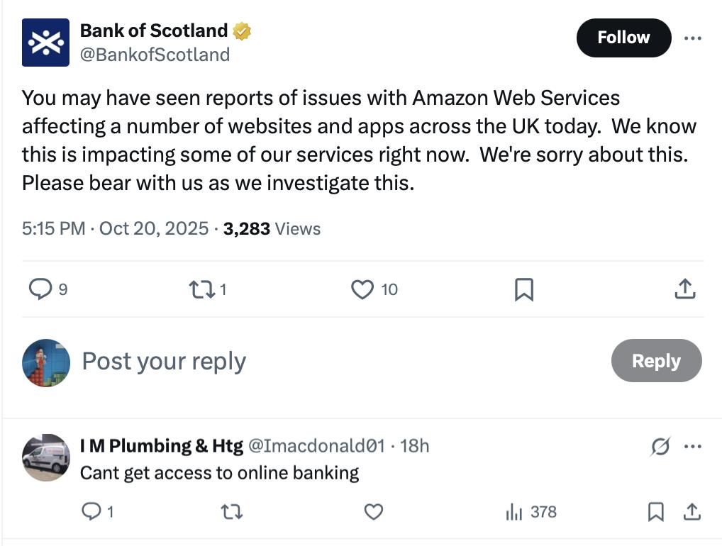 政府机关也受到影响,苏格兰银行发帖称“AWS 影响了英国许多网站和程序,包括我们的服务。”用户都用不了网上银行。英国税务、支付和海关当局的网站也都掉线。