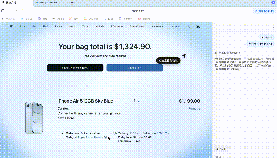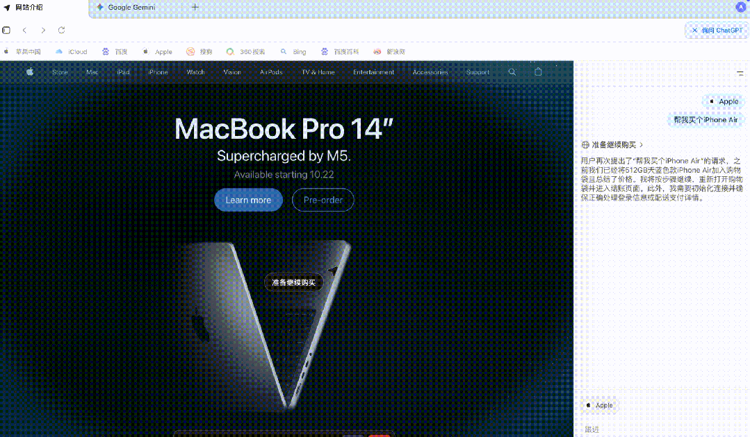 比如,我把它带到了苹果官网,直接让它帮我购买一台iPhone Air。