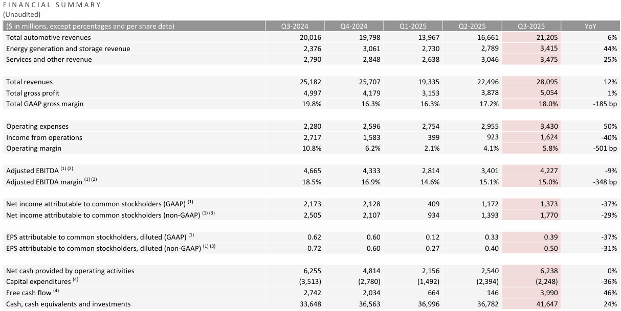 财务数据方面,第三季度毛利润达50.54亿美元,同比增长1%,GAAP毛利率18%。尽管受运营费用增加、监管信贷减少等因素影响,GAAP净利润13.73亿美元、非GAAP净利润17.7亿美元分别同比下降37%和29%,但现金流表现强劲,经营现金流维持62.38亿美元的稳定水平,资本支出同比下降36%至22.48亿美元。截至季度末,公司现金、现金等价物及投资总额达416.47亿美元,同比增长24%,为后续产能扩张与技术研发提供充足资金保障。