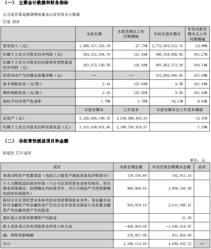 单季度表现同样强劲,2025年第三季度公司实现营业收入10.6亿元,同比增长27.73%;归属于上市公司股东的净利润2.64亿元,同比大幅增长121.44%;归属于上市公司股东的扣除非经常性损益的净利润2.63亿元,同比增幅达126.44%。