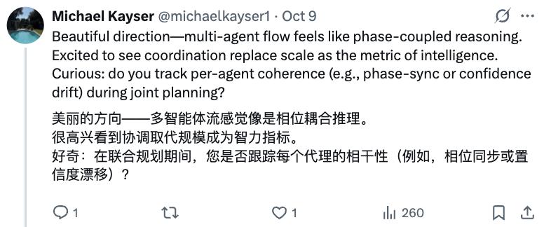 多智能体流(multi-agent flow)给人的感觉就像“相位耦合推理”(phase-coupled reasoning)。很期待看到“协同能力”取代“规模”,成为衡量智能的指标。