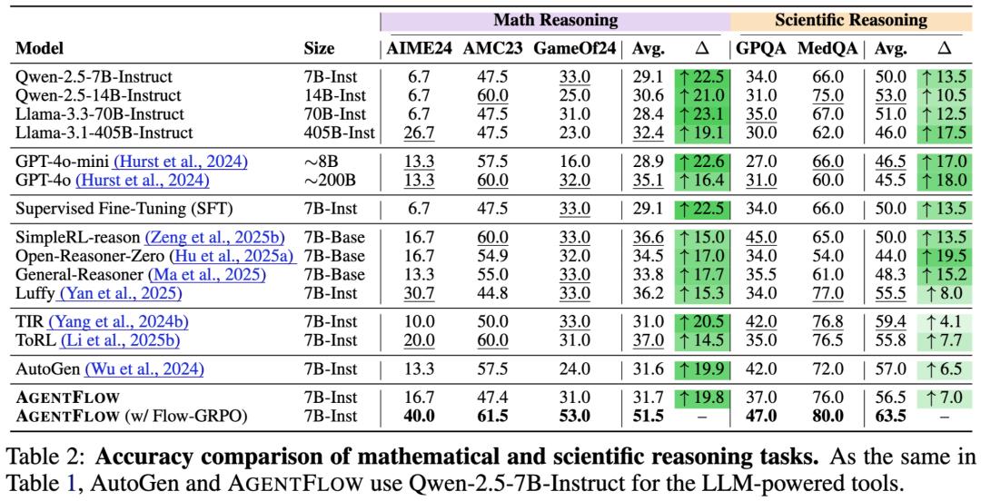 值得注意的是,AgentFlow的表现甚至超过了大规模的专有模型,如GPT-4o(~200B)。