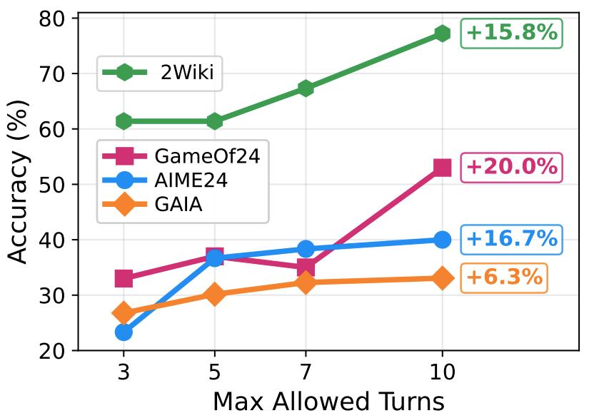 对于相同的数据集下的不同难度任务:譬如说多跳搜索(Multihop Search),智能体任务中的密集长链推理任务,AgentFlow在经过 FlowGRPO训练后能够随着最大限制推理步数的上升稳步提升性能,同时又不会大幅提升平均推理步数——这表示对于长难任务会增加有效的推理步数来提升正确率,而不会一味地所有任务都随着最大轮数限制而延长推理步数。
