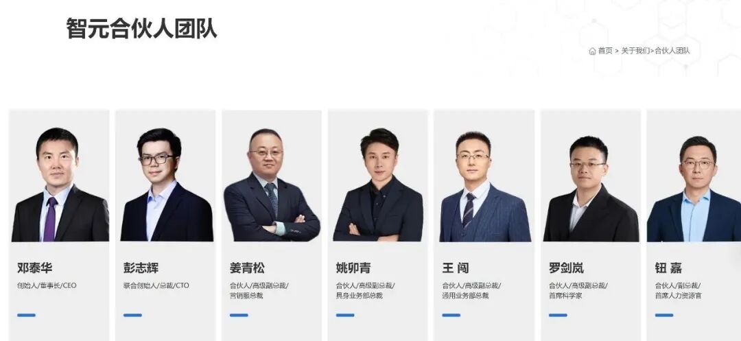 9月19日,智元在官网上正式披露了合伙人团队名单:邓泰华任创始人、董事长、CEO;彭志辉任联合创始人、总裁、CTO;姜青松任合伙人、高级副总裁、营销服总裁;姚卯青任合伙人、高级副总裁、具身业务部总裁;王闯任合伙人、高级副总裁、通用业务部总裁;罗剑岚任合伙人、高级副总裁、首席科学家;钮嘉任合伙人、副总裁、首席人力资源官。