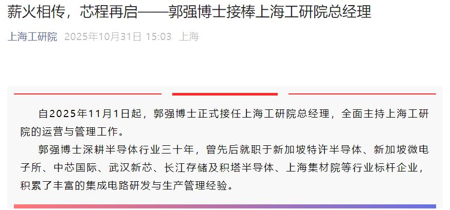 10月31日,上海工研院宣布自2025年11月1日起,郭强博士正式接任上海工研院总经理,全面主持上海工研院的运营与管理工作。