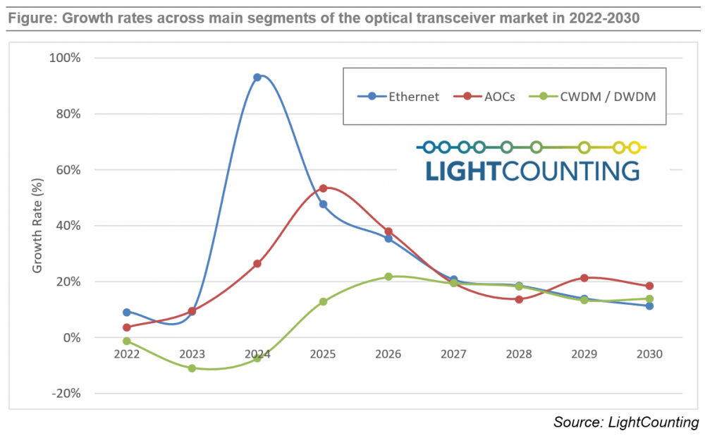 LightCounting表示,全球光模块市场在经历2023年下降3%和2024年增长42%之后,预计未来5年将以22%的年复合增长率扩张。AI集群应用对以太网光模块和AOC的强劲需求将是主要增长动力,云公司和电信服务提供商对DWDM网络的升级也将做出重大贡献。